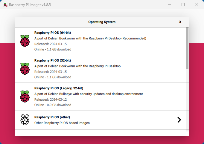 Select the (Recommended) entry which is usually the first one. For Pi 4 and 5 models, that will be Raspberry Pi OS (64-bit). For older models it will be Raspberry Pi OS (Legacy, 32-bit).